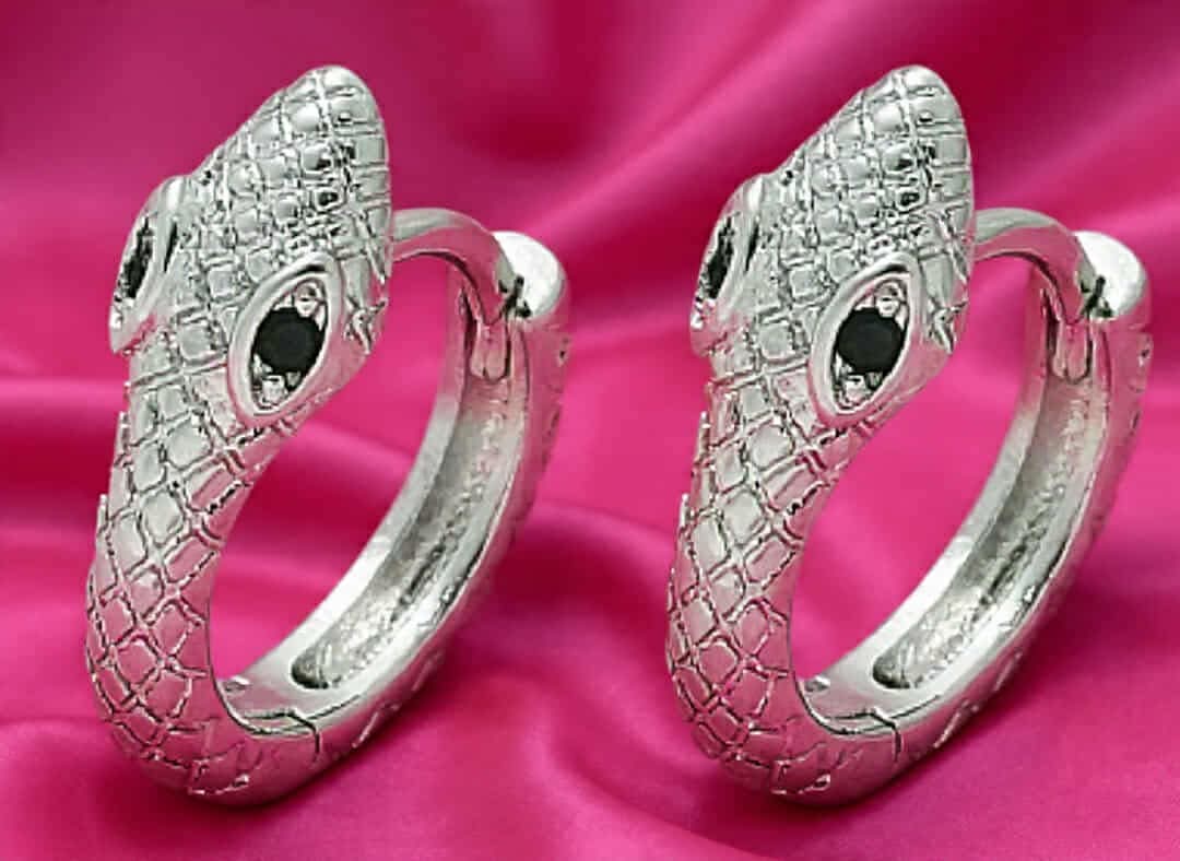 Medusa bittesmå minislanger med sort zirkoniastein. Sølvfargede huggies belagt med platinum.
