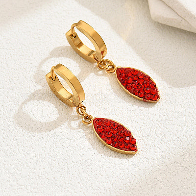 201 rustfritt stål belagt med 18 karat gull og røde rhinestones i dråpeform. Størrelse: 35mm x 8mm.