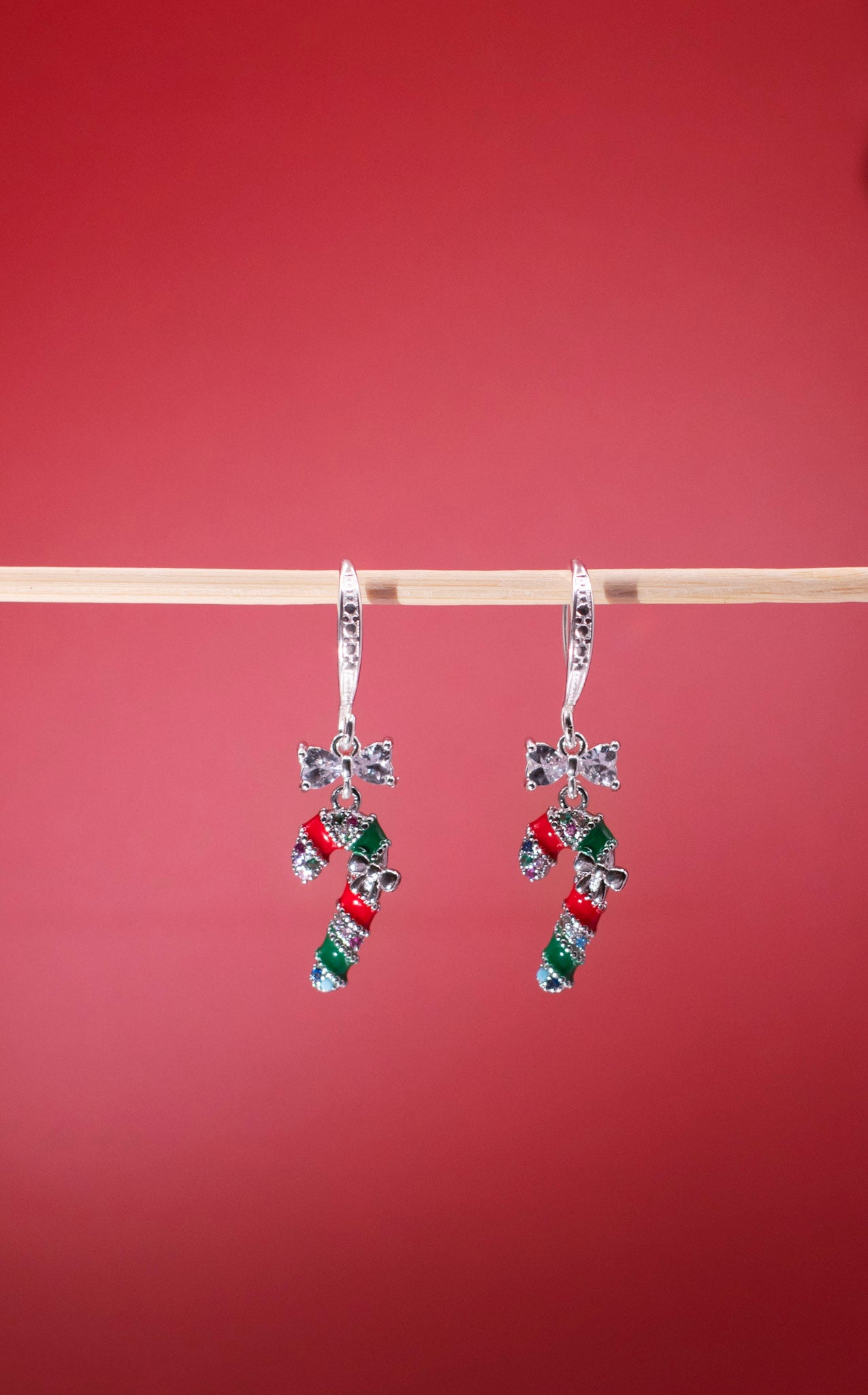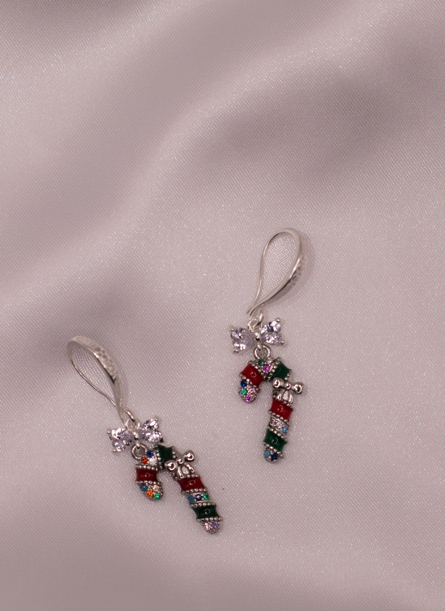 Sukkertøystang belagt med ekte platinum, festet på solide kadmium- og blyfrie 925 sterlingbelagte ørekroker med mønster. Sløyfecharm i zirkoniastein festet med 925 Sterling Silver.
